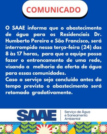 O Serviço de Água e Saneamento Ambiental de Juazeiro-SAAE informa que o abastecimento de água para os Residenciais Dr. Humberto Pereira e São Francisco será interrompido nesta terça-feira (24) das 08 às 17 horas para que a equipe possa fazer o entrocamento de uma rede visando a melhoria na oferta de água para essas comunidades. Caso […]
