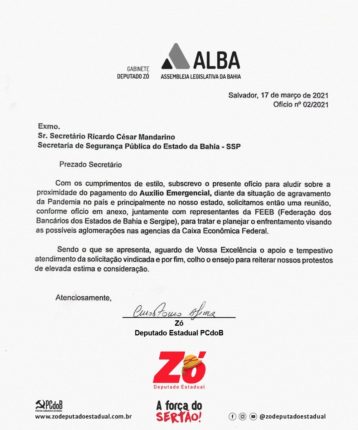 Nesta quinta-feira, 18, o deputado estadual Zó enviou ofício às secretarias da Saúde e da Segurança Pública do estado para que fiquem atentas ao período de recebimento do auxílio emergencial e assim planejem me conjunto ações que possam evitar aglomerações nas agências bancárias da Caixa Econômica na Bahia, e assim diminuir o contágio da Covid-19, […]