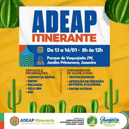 A Prefeitura de Juazeiro, por meio da Agência de Desenvolvimento Econômico, Agricultura e Pecuária (Adeap) vai realizar na próxima sexta-feira e sábado (dias 13 e 14), a primeira edição do ‘Adeap Itinerante Cuidando do Interior’ de 2023. A ação vai acontecer no Parque JW, no Jardim Primavera, das 08h às 12h. O projeto que tem […]