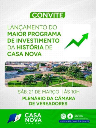 A Prefeitura de Casa Nova apresenta, neste sábado (21/03), às 10h, no plenário da Câmara de Vereadores, o maior pacote de investimentos da história do município. A iniciativa marca a chegada de ainda mais desenvolvimento, com ações estruturantes que vão impulsionar o crescimento da cidade e gerar impactos reais na vida da população. O prefeito […]
