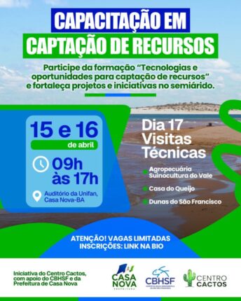 Entre os dias 15 e 17 de abril, o município de Casa Nova (BA) será sede de uma programação voltada ao fortalecimento de iniciativas no semiárido, reunindo capacitação, plenária e visitas técnicas. As atividades acontecem no auditório da Unifan, sempre das 9h às 17h, e são promovidas pelo Centro Cactos, com apoio do Comitê da […]