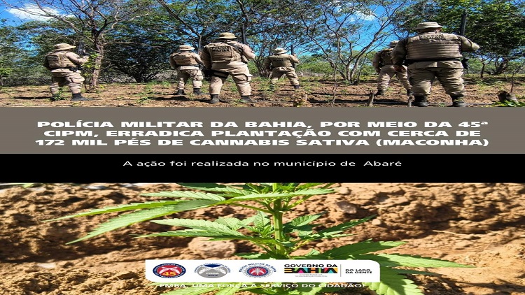 A Polícia Militar da Bahia (PMBA), por meio da 45ª Companhia Independente de Polícia Militar (45ª CIPM/Curaçá), erradicou neste sábado (14) uma plantação com cerca de 172 mil pés de Cannabis sativa (maconha), além de um vasto material utilizado para irrigação da plantação, localizada nas proximidades da localidade de Pau de Colher, zona rural do […]