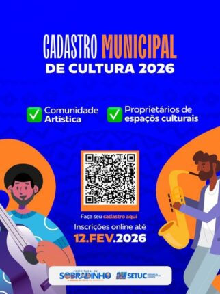 A Prefeitura de Sobradinho, através da Secretaria de Turismo, Cultura e Esporte (SETUC), convoca a comunidade artística e os donos de espaços culturais locais para realização do Cadastro Municipal de Cultura do ano 2026. As inscrições serão realizadas na modalidade online, entre os dias 10 de dezembro de 2025 e 12 de fevereiro de 2026. […]