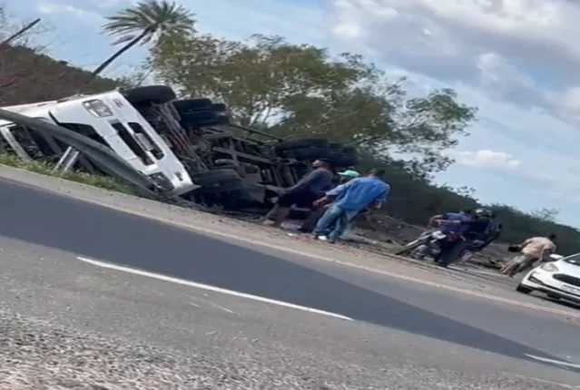 Carreta tomba na BR-407 próximo a entrada do Burrinho, zona rural de Petrolina (PE)