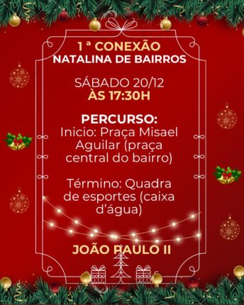 A 1ª Conexão Natalina de Bairros iniciou, nesta segunda-feira (08/12), a campanha Natal Solidário, que tem como objetivo arrecadar alimentos não perecíveis para beneficiar dezenas de famílias da comunidade do João Paulo II. A ação convida moradores e parceiros a contribuírem com doações que farão a diferença na mesa de quem mais precisa neste fim […]