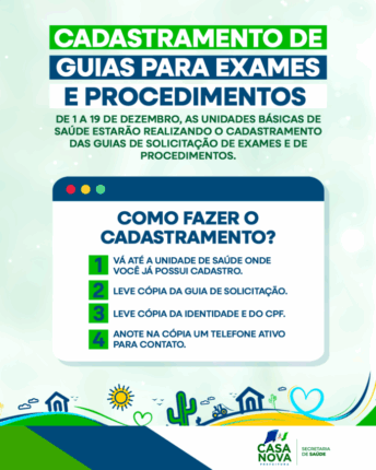 A Prefeitura de Casa Nova, por meio da Secretaria de Saúde, deu início ao cadastramento das guias de exames e procedimentos. Até o dia 19 de dezembro, todas as Unidades Básicas de Saúde (UBSs) estarão recebendo os pacientes que já possuem guias emitidas para realizar o registro. A diretora da Atenção Primária à Saúde (APS), […]