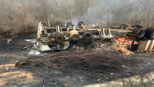 Caminhão capota e pega fogo na BA-026; motorista não é encontrado no local