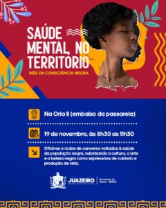 A Prefeitura de Juazeiro, por meio da Secretaria Municipal de Saúde/Sesau, realiza na próxima terça-feira (19) a ação “Saúde Mental no Território”, em alusão ao Mês da Consciência Negra. O encontro acontecerá na Orla II (embaixo do mirante), das 8h30 às 11h30, com programação voltada à valorização da cultura e da identidade negra. Durante o […]