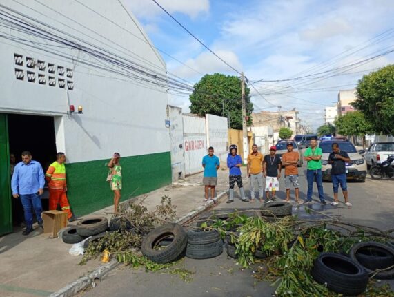 Trabalhadores da Empresa Limp City em protesto interditam a rua Mestre Lula no centro de Juazeiro (BA)