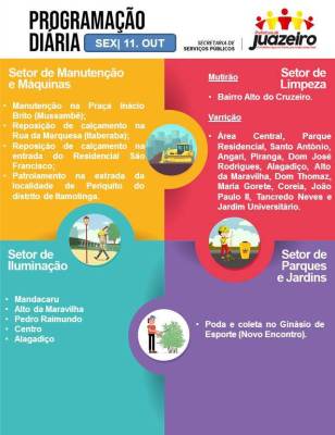 A Secretaria de Serviços Públicos (SESP) informa à população juazeirense a programação dos trabalhos relacionados à iluminação e limpeza dos espaços públicos para esta sexta-feira (11). As equipes de mutirão de limpeza trabalham no bairro Alto do Cruzeiro; as equipes de varrição atendem hoje área central, Parque Residencial, Santo Antônio, Angari, Piranga, Dom José Rodrigues, […]