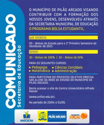 O Prefeito de Pilão Arcado, Orgeto Bastos (PP) e a Secretária de Educação, Rosemeire de Almeida Rocha, anunciam essa semana a criação do “Programa Bolsa Estudantil”, que vai oferecer 50 bolsas de estudo, integrais e parciais, Pedagogia, Ciências Contábeis, Matemática e Administração. Inicialmente serão 30 bolsas integrais e 20 bolsas de 50% do custo e válidas […]