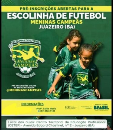 Estão abertas as pré-inscrições para a Escolinha de Futebol Meninas Campeãs de Juazeiro (Ba). As aulas são realizadas no Centro Territorial de Educação Profissional (CETEP), localizado na Avenida Edgard Chastinet, nº 12, antiga Escola Agroténica. Mais informações com a Profª Maria Luiza pelo telefone: (87) 98823 – 9148. As aulas são gratuitas. https://acaopopular.net/jornal/wp-content/uploads/2026/03/WhatsApp-Video-2026-03-28-at-07.39.55-1.mp4?_=1