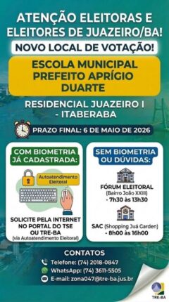 Eleitores e eleitoras de Juazeiro devem ficar atentos a uma atualização importante da Justiça Eleitoral. Foi disponibilizado um novo local de votação vinculado à 47ª Zona Eleitoral. De acordo com as informações divulgadas, o novo ponto de votação funcionará na Escola Municipal Prefeito Aprígio Duarte, localizada no Residencial Juazeiro I, bairro Itaberaba. Além da mudança, […]