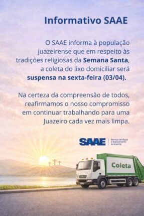 O SAAE-Serviço de Agua e Saneamento Ambiental-Juazeiro informa que na sexta-feira (03) a coleta de lixo será suspensa em respeito a tradição religiosa. A empresa através de nota agrade a compreensãoAscom SAAE