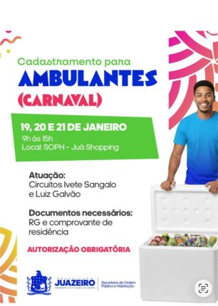 A Prefeitura de Juazeiro vai abrir o credenciamento para o comércio durante os festejos do Carnaval de Juazeiro 2026 — “O Carnaval do Brasil começa aqui!” — que acontecerá de 29 de janeiro a 1º de fevereiro. A autorização é obrigatória e será concedida pela Secretaria de Ordem Pública e Habitação (SOPH), responsável pela organização […]