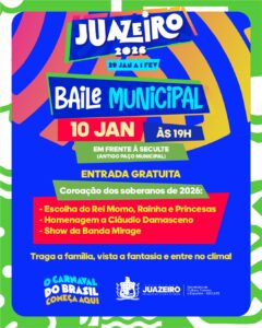 O clima de Carnaval já tomou conta de Juazeiro com a realização do Baile Municipal, que acontece no sábado, 10 de janeiro, a partir das 19h, em frente à Secretaria de Cultura, Turismo e Esportes (Seculte), no antigo Paço Municipal. A entrada é gratuita, mas os participantes podem levar 1kg de alimento não perecível, que […]