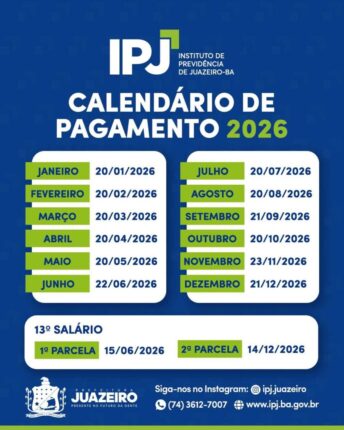O Instituto de Previdência de Juazeiro (IPJ) divulgou o calendário oficial de pagamento dos benefícios previdenciários para o ano de 2026. O cronograma contempla aposentados e pensionistas vinculados ao Regime Próprio de Previdência Social (RPPS) do município e tem como objetivo garantir previsibilidade e organização financeira aos segurados. De acordo com o IPJ, os pagamentos […]
