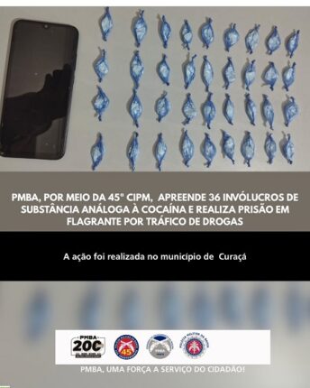 A Polícia Militar da Bahia (PMBA), por intermédio da 45ª Companhia Independente de Polícia Militar (CIPM/Curaçá), realizou, neste sábado (21), a apreensão de 36 invólucros de substância análoga à cocaína e a prisão em flagrante por tráfico de drogas no município de Curaçá. Durante a intensificação do policiamento na Avenida Ulysses Guimarães, nas proximidades do […]