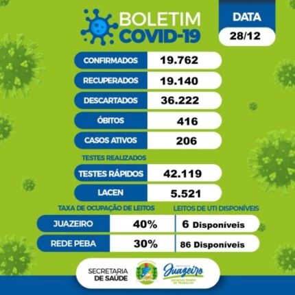 Juazeiro registrou 12 novos casos de Covid-19 neste sábado (25). A informação está no boletim epidemiológico da Secretaria Municipal de Saúde (Sesau). Não houve registro de óbito. O município permanece com 414 mortes provocadas pela doença. De acordo com o levantamento, 19.691 moradores foram infectados desde o início da pandemia na cidade, dos quais 19.107 […]