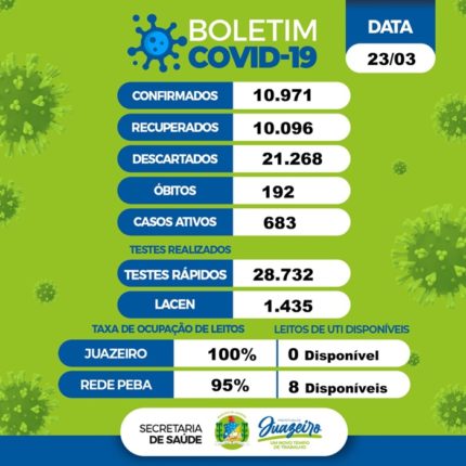 Juazeiro registrou 10 novos casos da Covid-19 nas últimas 24 horas. A informação está no boletim epidemiológico da Secretaria Municipal de Saúde deste sábado (3). De acordo com o informativo, 11.733 moradores foram infectados desde o início da pandemia na cidade, dos quais 10.702 já estão recuperados. Os casos descartados somam 22.387. Juazeiro tem 826 […]