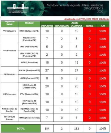 Todos os leitos de UTI destinados ao tratamento da Covid-19 no Vale do São Francisco encontram-se 100% lotados. Existe, inclusive, uma fila de espera de 12 pacientes.Esses dados são da Rede PEBA (Pernambuco-Bahia), que engloba 53 municípios. O Hospital Universitário (HU) não aparece na planilha abaixo por ser da 8ª Geres e não consta na […]