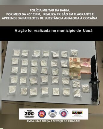 Polícia Militar da Bahia, por meio da 45ª CIPM, realiza prisão em flagrante e apreende 34 papelotes de substância análoga à cocaína no município de Uauá