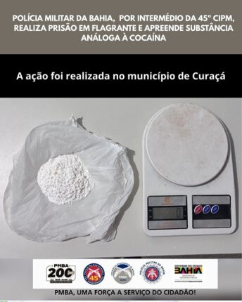 Polícia Militar da Bahia, por meio da 45ª CIPM, realiza prisão em flagrante e apreende substância análoga à cocaína no município de Curaçá