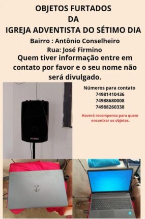 Moradores do bairro Antonio Conselheiro, locallizado em Juazeiro pedem as autoridades mais segurança. Um furto na Igreja Adventista do Sétimo Dia, realizado neste final de semana chamou a atenção da comunidade. “Nem as igrejas estão livres”, diz um dos moradores que prefere não ser identificado.