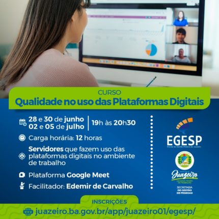 A Prefeitura de Juazeiro, através da Escola de Gestão Pública (Egesp), vai promover nos dias 28, 30 de junho e 02 e 05 de julho, um curso sobre “Qualidade no uso das Plataformas Digitais”. O objetivo é atualizar os servidores municipais quanto ao uso de ferramentas virtuais no ambiente de trabalho. Dentre as atividades desenvolvidas, […]