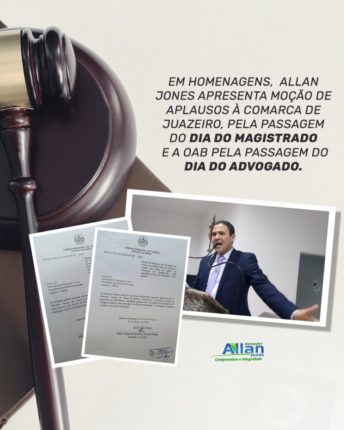 Em homenagens, Allan Jones apresenta Moção de Aplausos à Comarca de Juazeiro, pela passagem do Dia do Magistrado e a OAB pela passagem do Dia do Advogado
