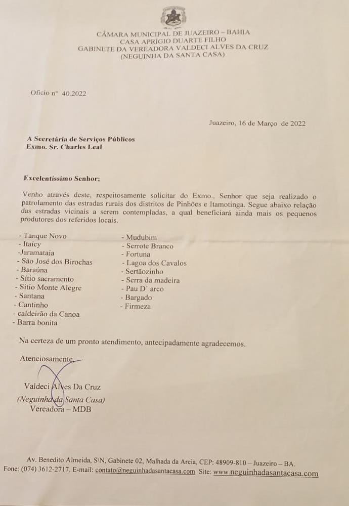 A vereadora Neguinha da Santa Casa comemorou o início do patrolamento das estradas vicinais das comunidades de Itamotinga e Pinhões. Se acordo com a parlamentar, a mesma já tinha solicitado à Prefeitura de Juazeiro para realizar os serviços.