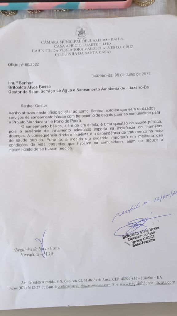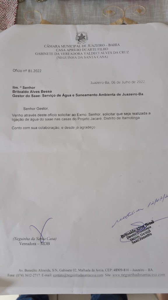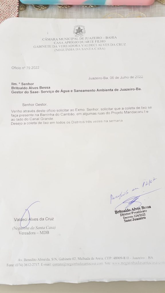 “Sai de lá satisfeita, pois o diretor, Britoaldo, nos recebeu e encaminhou todas as demandas. Meu objetivo é que essas comunidades seja bem tratadas pelo SAAE de Juazeiro e não falte água e nem saneamento básico para eles”, disse a vereadora Neguinha da Santa Casa.
