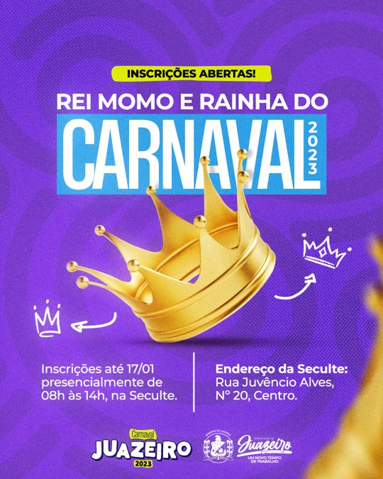 Continuam abertas as inscrições para o concurso que irá eleger o Rei Momo e a Rainha, além das duas Princesas do Carnaval de Juazeiro. Os interessados têm até o dia 17 de janeiro (terça-feira ) para comparecer presencialmente na Secretaria de Cultura, Turismo e Esportes (Seculte), das 8h às 14h e realizar as inscrições.
