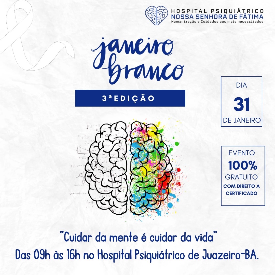 Com intuito de ampliar a discussão sobre a saúde mental e promover ações para o bem estar da mente e do corpo, o Hospital Psiquiátrico Nossa Senhora de Fátima (HPNSF), localizado no município de Juazeiro-BA, lança a 3ª edição do Janeiro Branco, com o tema: “Cuidar da mente, é cuidar da vida”.