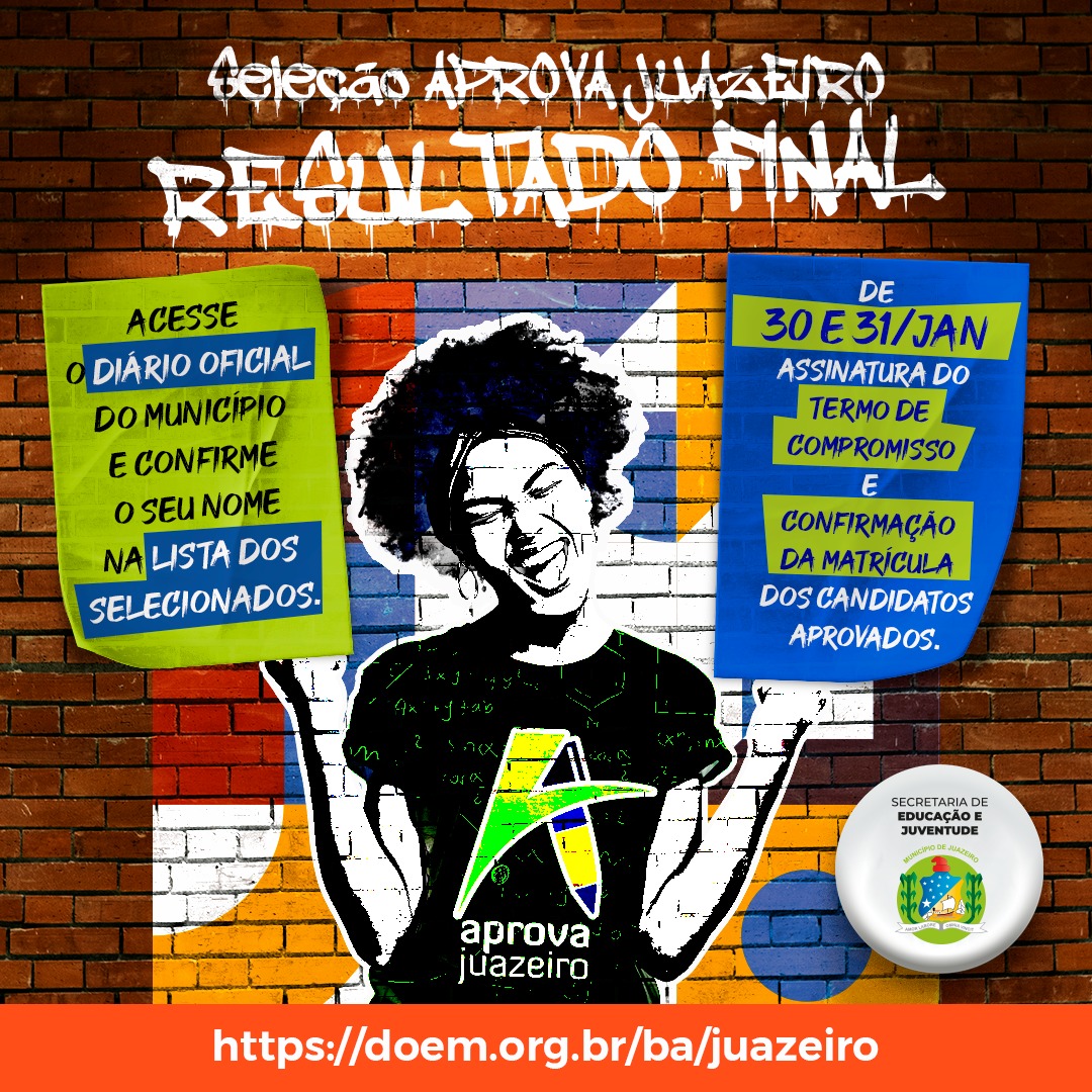 Candidatos que participaram do processo seletivo para o Programa Aprova Juazeiro, da Secretaria de Educação e Juventude (Seduc), já podem consultar o resultado final, disponível no Diário Oficial do Município (Doem). Os candidatos aprovados deverão realizar a confirmação de matrícula e assinatura do Termo de Compromisso nos dias 30 e 31 de janeiro, no prédio da Seduc, localizado na Rua Antônio Pedro, número 139, Centro.