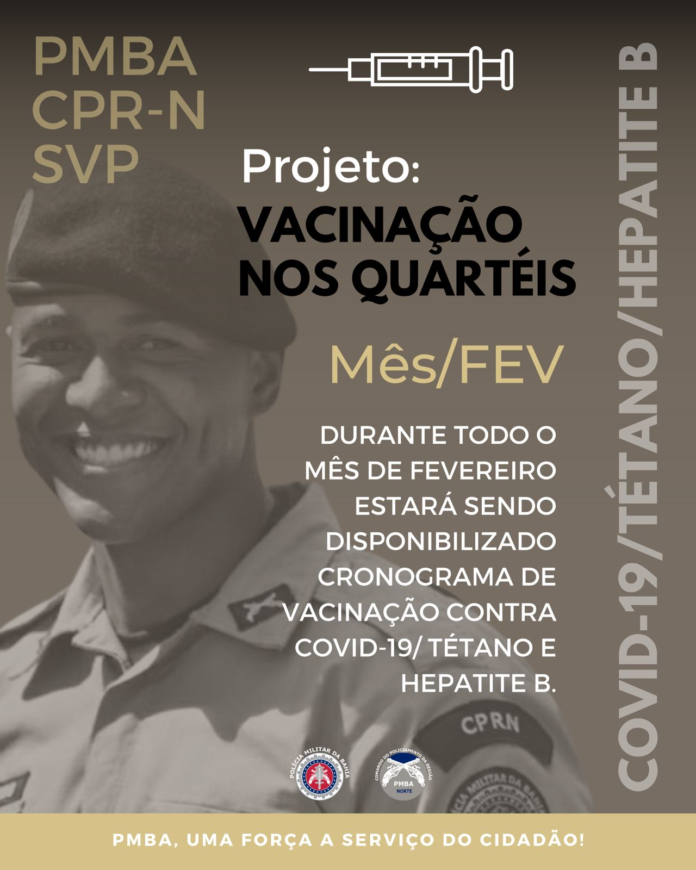 A Polícia Militar da Bahia (PMBA), através do Comando de Policiamento da Região Norte (CPR-N), comandado pelo Coronel PM Valter Araújo, tendo em vista à aproximação do período momesco e de outras festas populares, lançou o Projeto “Vacinação nos Quartéis”, para esse mês de fevereiro, ontem, quinta-feira (9), em todas as Unidades Operacionais subordinadas, conforme orientação do Excelentíssimo Senhor Comandante-Geral, Coronel PM Coutinho.