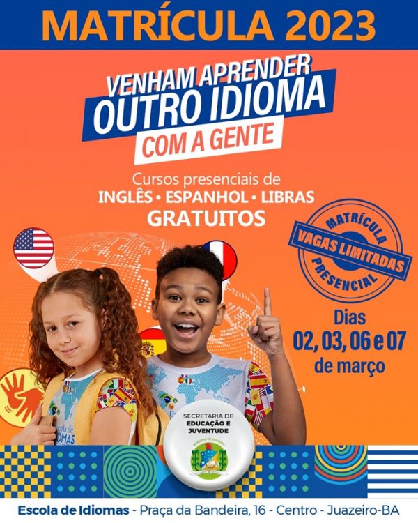 A Escola de Idiomas da Prefeitura de Juazeiro abrirá nesta quinta-feira (02), o período de matrículas para os cursos gratuitos de Inglês, Espanhol e Língua Brasileira de Sinais (Libras), voltados para alunos da rede municipal, matriculados entre o 4º e 9º ano, servidores, e professores que atuam na Educação municipal.