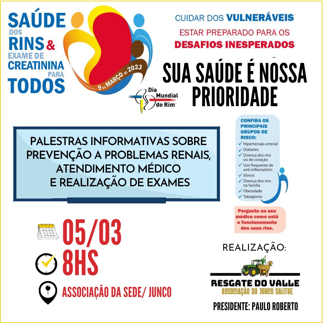 Dia 05/03 temos um compromisso de se fazer presente na sede do distrito de Junco/Salitre em parceria com o grupo Resgate do Vale, liderado pelo presidente da associação: Paulo Roberto. “Será um momento bastante enriquecedor para a população”, destaca.