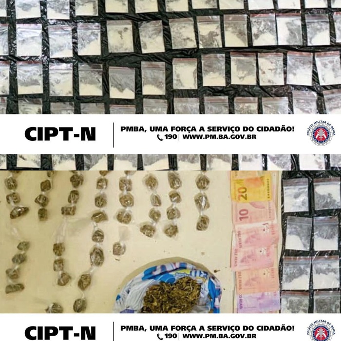 Na madrugada deste domingo (23), durante a Operação Força Norte Tiradentes, guarnições da RONDESP Norte em patrulhamento no município de Caém-BA, em apoio à 24ª CIPM, realizaram a apreensão de 320g de erva seca, aparentemente maconha, 130 papelotes de pó branco, aparentemente cocaína, além de R$224,00 (duzentos e vinte e quatro reais) em posse de um indivíduo, que, segundo levantamento posterior, seria o braço direito da liderança do tráfico da localidade.