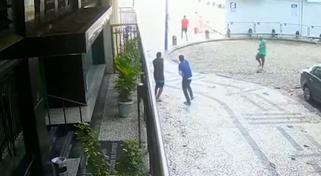 Os suspeitos agredindo o jogador de vôlei em Copacabana Reprodução