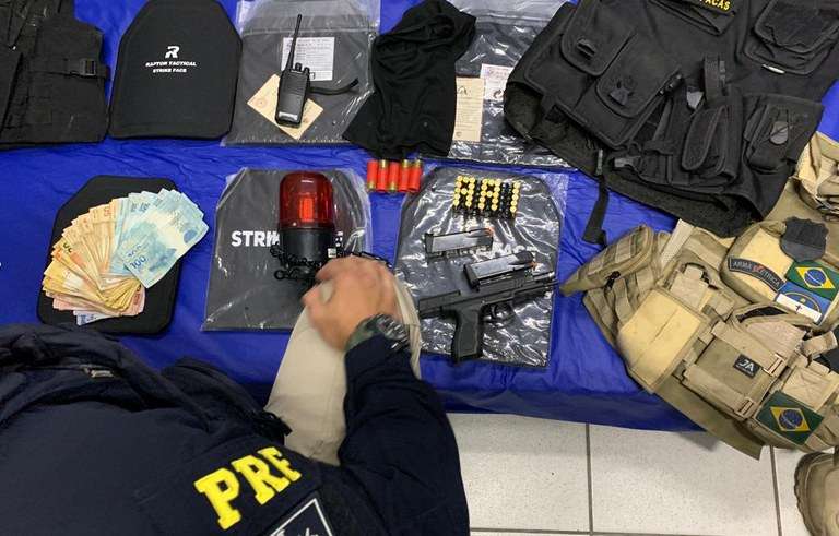 Pistola, munições, coletes balísticos, identidade de agente penitenciário com indícios de falsificação, rádio comunicador, sirene, touca balaclava e mais de R$5 mil foram encontrados pela Polícia Rodoviária Federal (PRF), na BR 232, em Jaboatão dos Guararapes (PE). O material era transportado em um carro roubado por dois homens que foram detidos na ação.