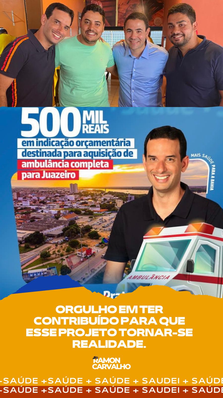 Ramon Carvalho expressou sua gratidão ao deputado federal Léo Prates pelos investimentos e emendas destinados ao município. Em particular, Carvalho parabenizou Prates e o secretário de saúde de Juazeiro, Allan Jones, pela recente destinação de recursos que possibilitará a aquisição de uma ambulância de suporte avançado (USA), beneficiando significativamente a saúde da comunidade.