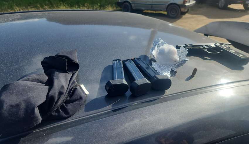 Os policiais realizaram uma verificação detalhada no carro e encontraram a pistola coberta por uma touca balaclava, além de um saco plástico com porções de cocaína. O material estava escondido em um fundo falso localizado no painel do veículo.