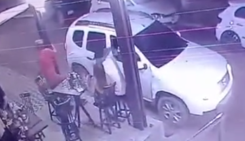 Vídeo que circula nas redes sociais mostra o momento do crime, que tem características de execução. Os dois estão sentados numa mesa, com outro homem, quando um veículo se aproxima.