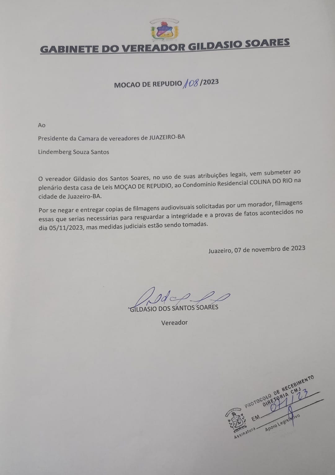 O vereador Gildásio Barão (PRTB) apresentou Moção de Repúdio durante sessão ordinária da Câmara Municipal, nesta quarta-feira (08), contra o Condomínio Colina do Rio por não entregar imagens de um casal de médicos que agrediu seu filho.