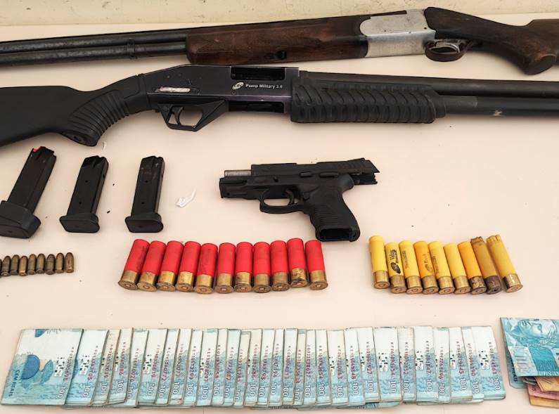 Uma pistola calibre 380, duas espingardas calibres 12 e 20, carregadores, munições e R$ 30 mil em espécie foram apreendidos.