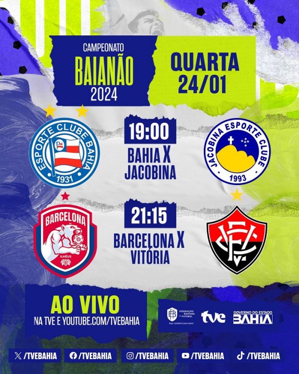 Nesta quarta (24), a TVE transmite mais duas partidas pela terceira rodada do Baianão. Primeiro, o Bahia enfrenta o Jacobina, às 19h (pré-jogo), na Arena Fonte Nova, em Salvador e, logo depois, o Barcelona enfrenta o Vitória, às 21h15 (pré-jogo), no Estádio Mário Pessoa, em Ilhéus. Os torcedores também podem acompanhar a partida pelo Youtube.com/tvebahia.