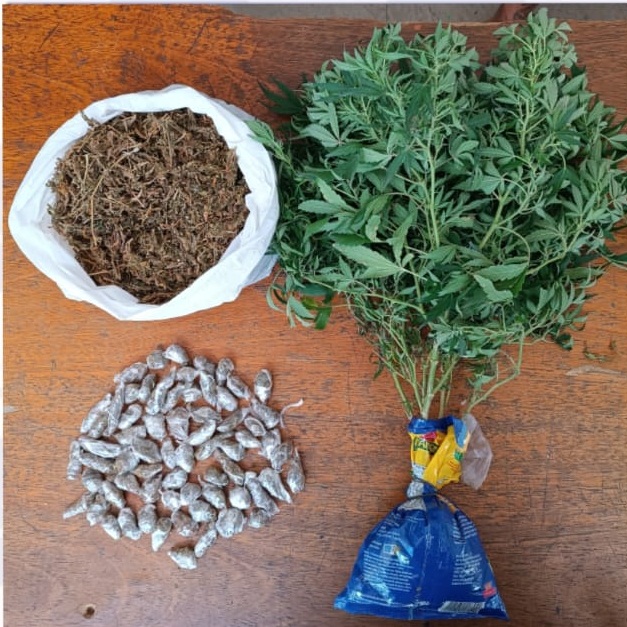 Foram apreendidos no local, 01 saco plástico contendo 368 gramas de Maconha, 66 papelotes da mesma droga, pesando 100 gramas, e 01 pé de Maconha.