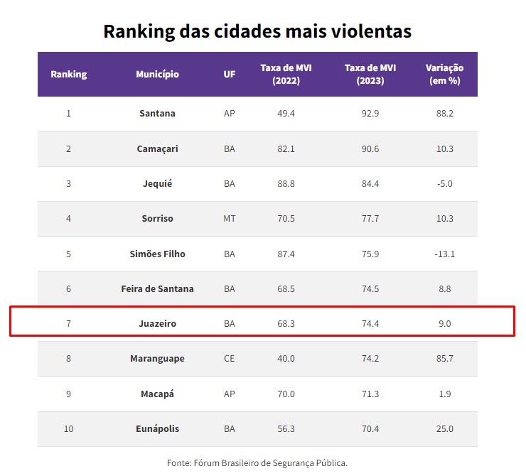 Santana, no Amapá, foi a campeão em mortes violentas, com 92,9 para cada 100 mil habitantes, praticamente o dobro dos registros de 2022, quando a taxa ficou em 49,4 por 100 mil habitantes. Juazeiro, por sua vez, ficou entre as 10 mais violentas, com 74,4 mortes a cada 100 mil habitantes. De 2022 para 2023 o crescimento em número de mortes violentas no município foi bastante significativo, um crescimento de 9%.