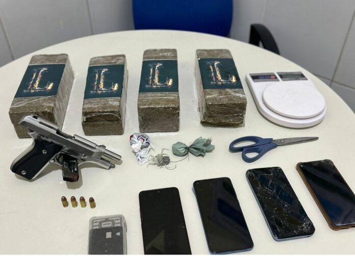 Durante a ação, que fez parte da Operação Força Total, os policiais apreenderam os seguintes materiais: 01 Pistola 380, 01 carregador, 04 munições intactas, 08 tabletes grandes de substâncias análoga a maconha, 02 balanças de precisão, 01 tesoura, 04 aparelhos celulares.